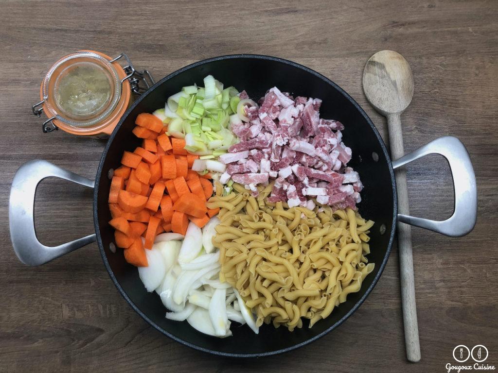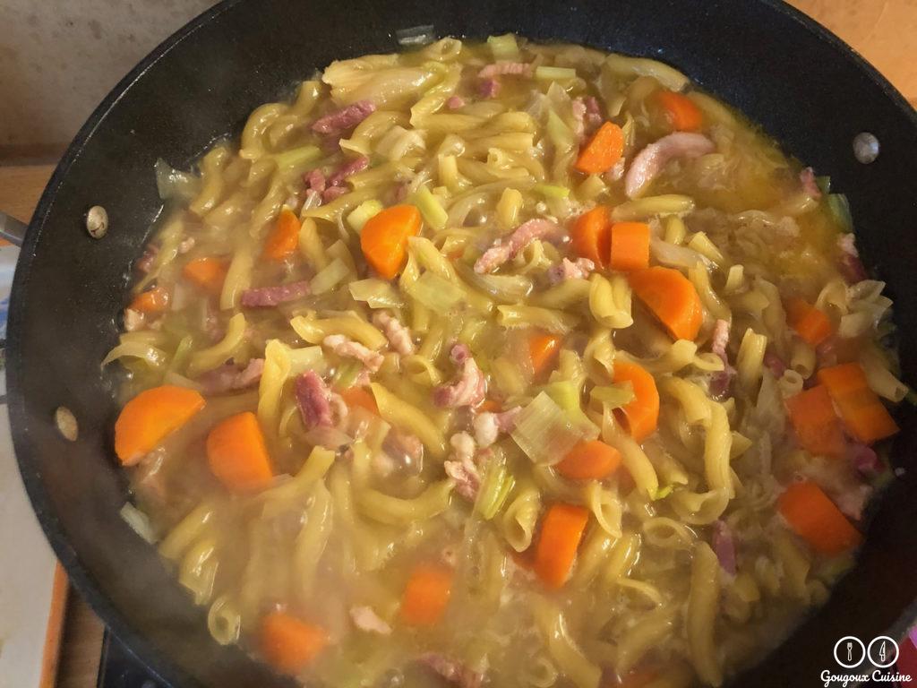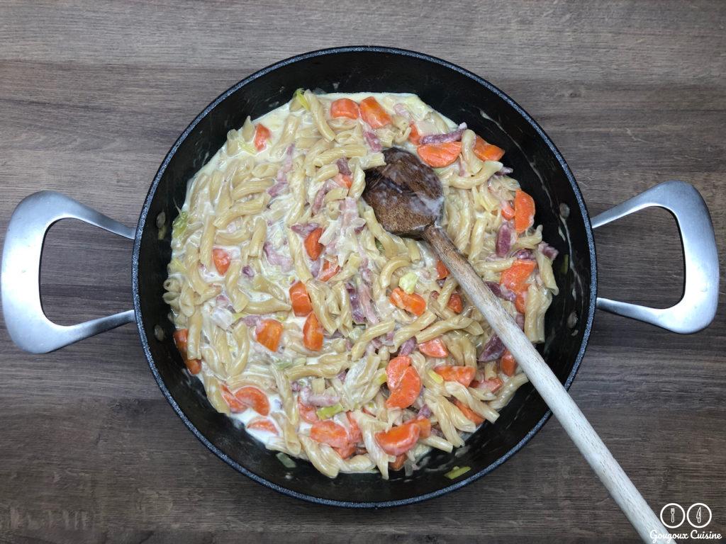 C’est l’hiver et j’ai donc pris le parti de faire avec des carottes et oignon, en y ajoutant des lardons (quand même 🙂 ). Une touche de crème à la fin et tout le monde s’est régalé. Le ptit a tout mangé (et oui ce sont des pâtes quand même …) !