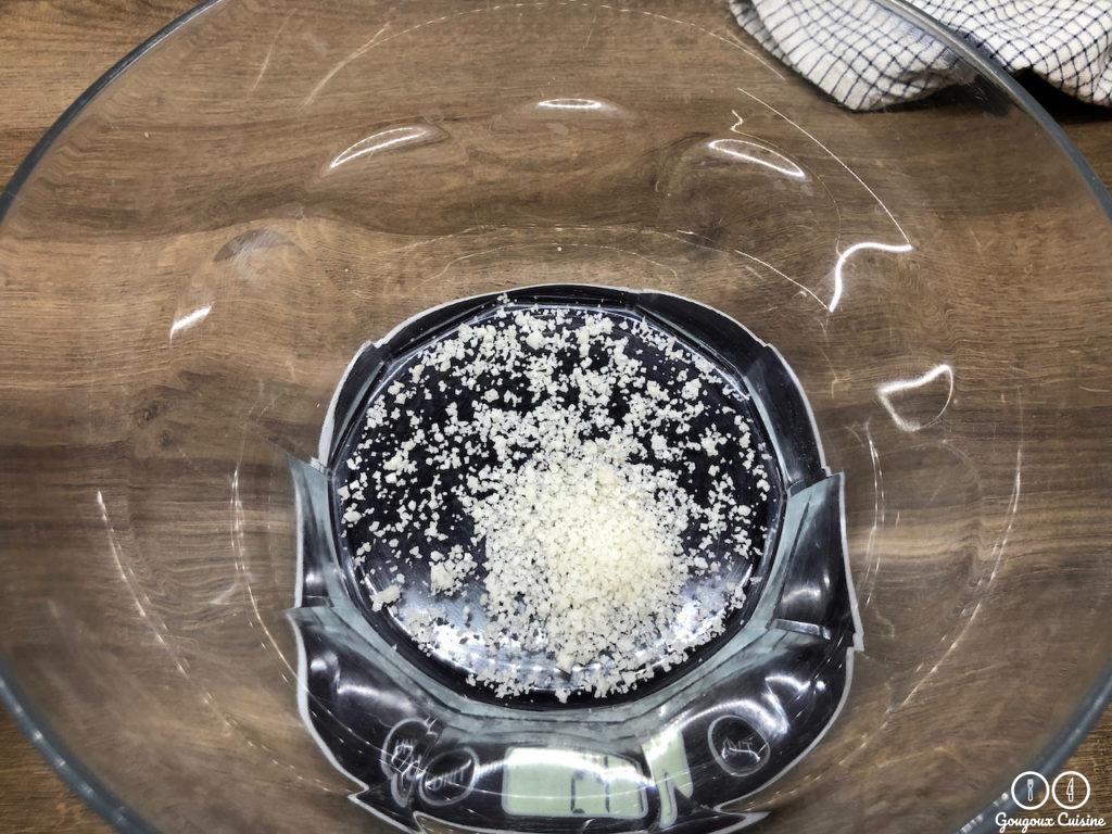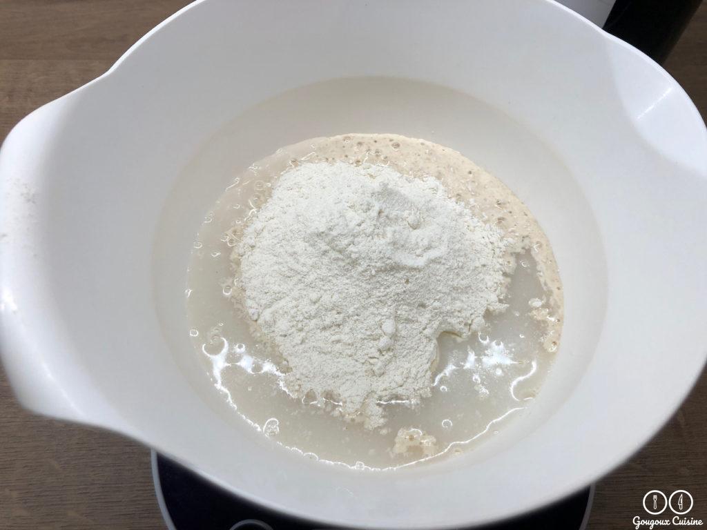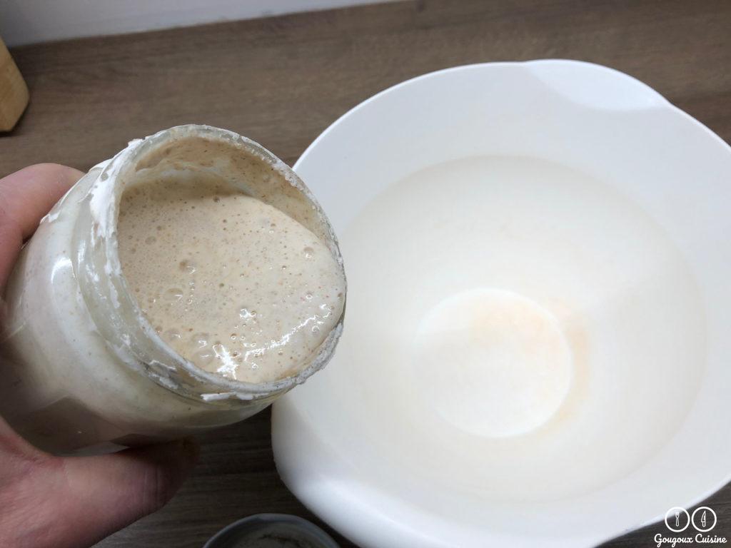 Jeudi, 21h : Verser le levain dans un saladier. Je mets systématiquement tout mon levain (environ 500-600g) que je rafraichis en entier à chaque fois. Ce me permet de le nourrir et de remettre le surplus au frigo.