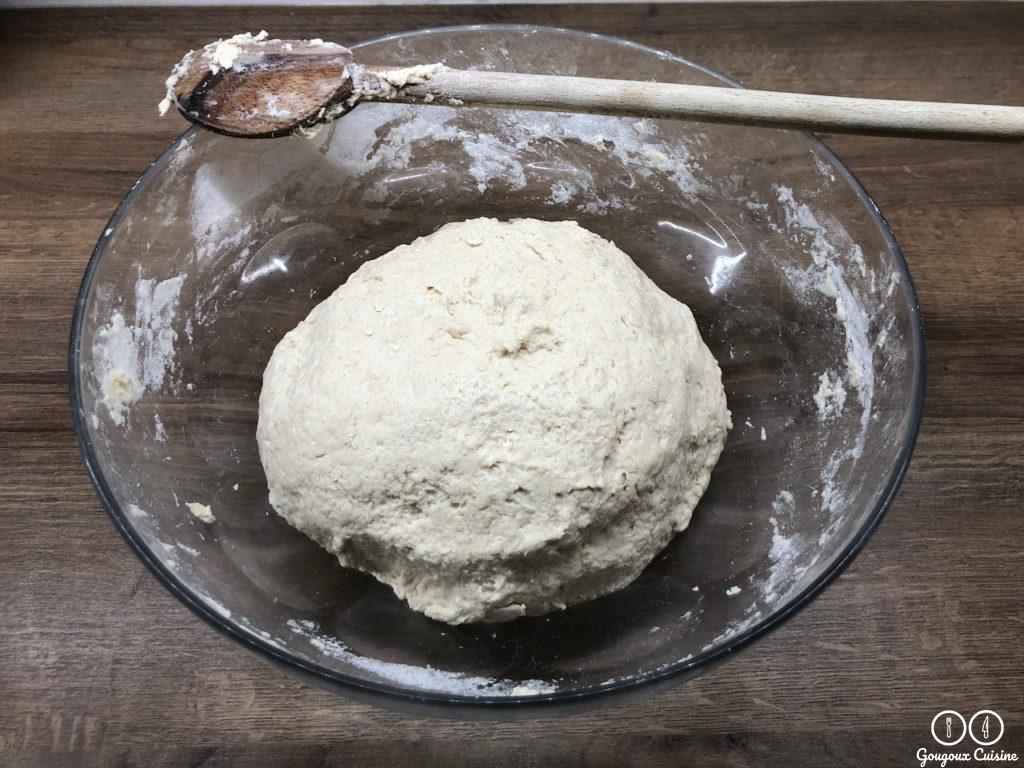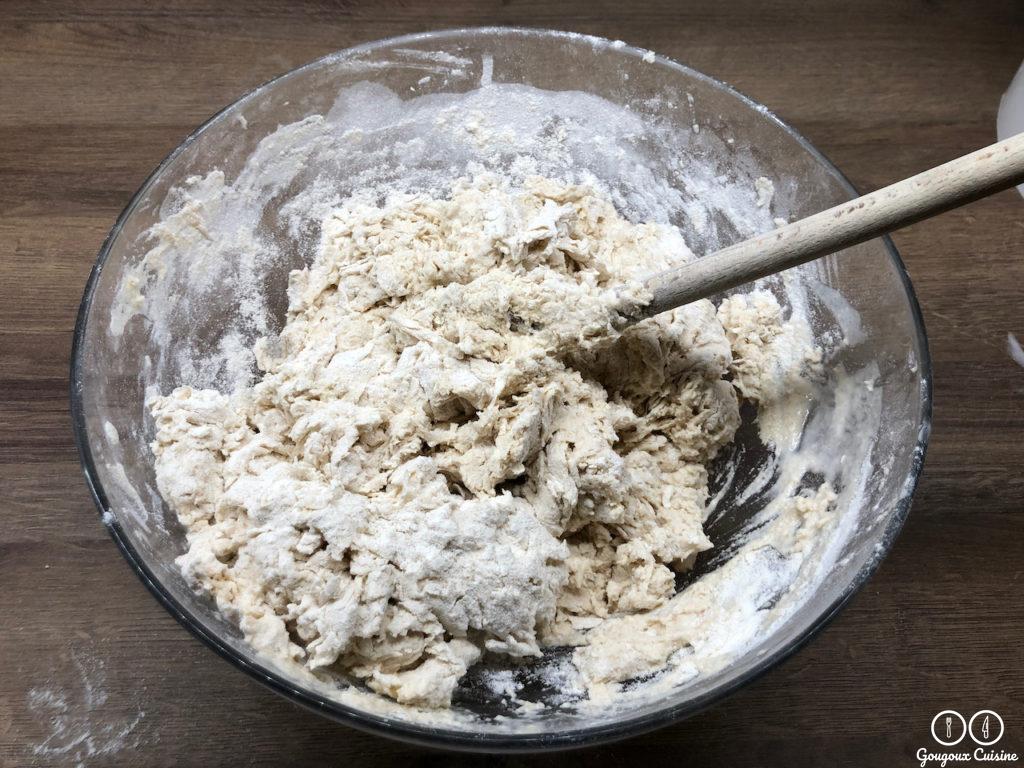 Au bout d'une dizaine de minute d'effort, on arrive à avoir une pâte homogène. L'idéal est d'avoir une corne de pâtisserie pour s'aider à remuer l'ensemble. Laisser reposer 30 à 40 min en couvrant le saladier d'un torchon.