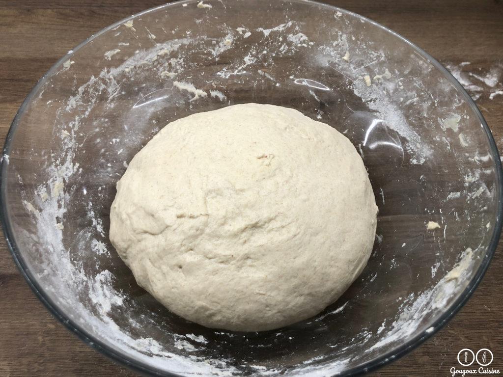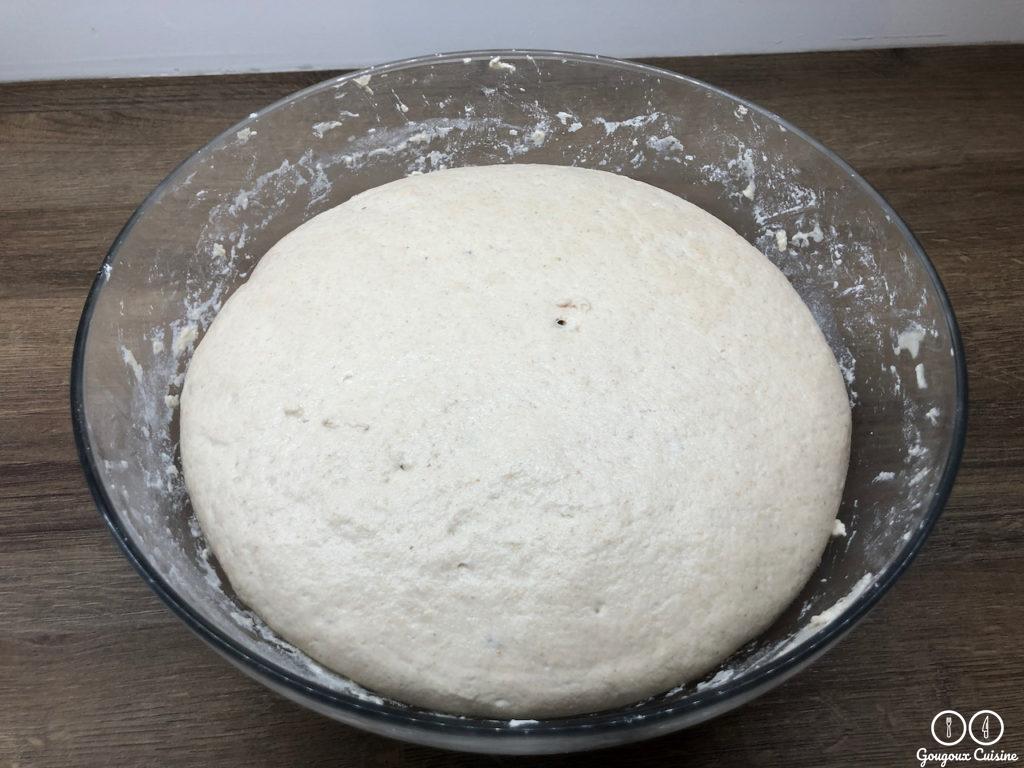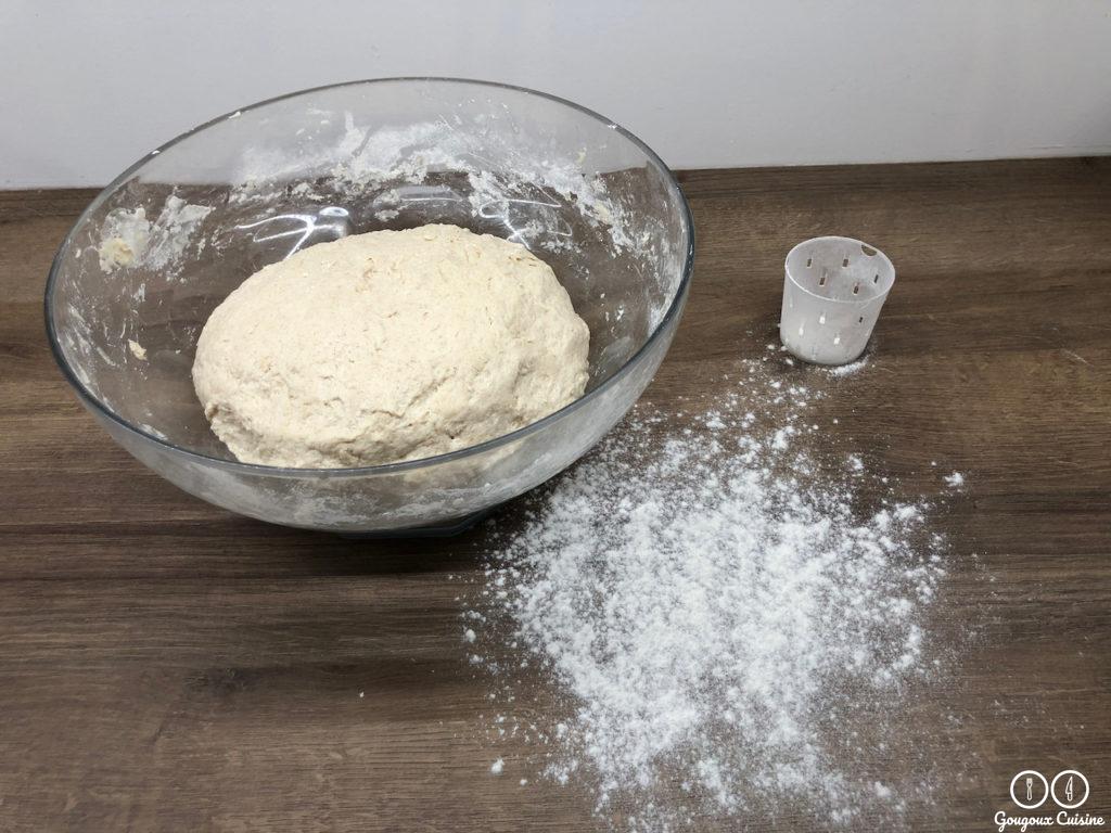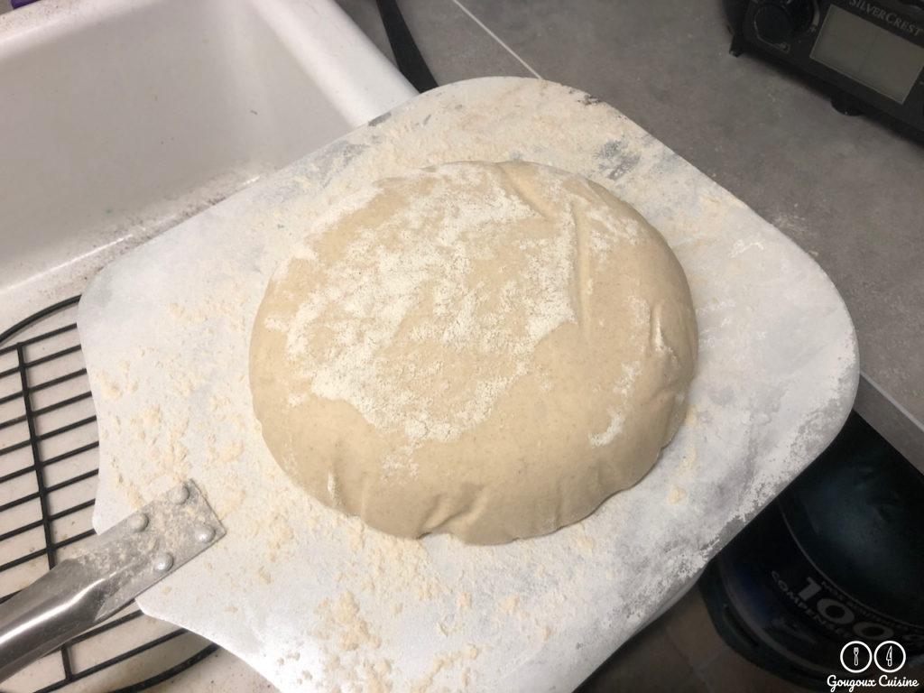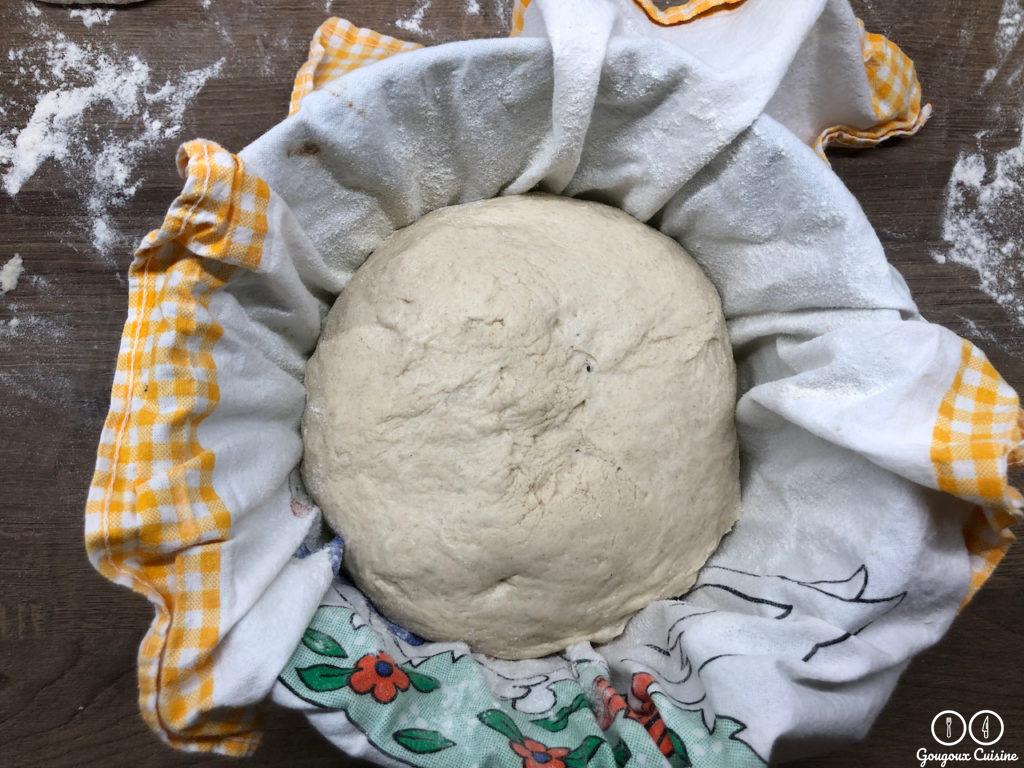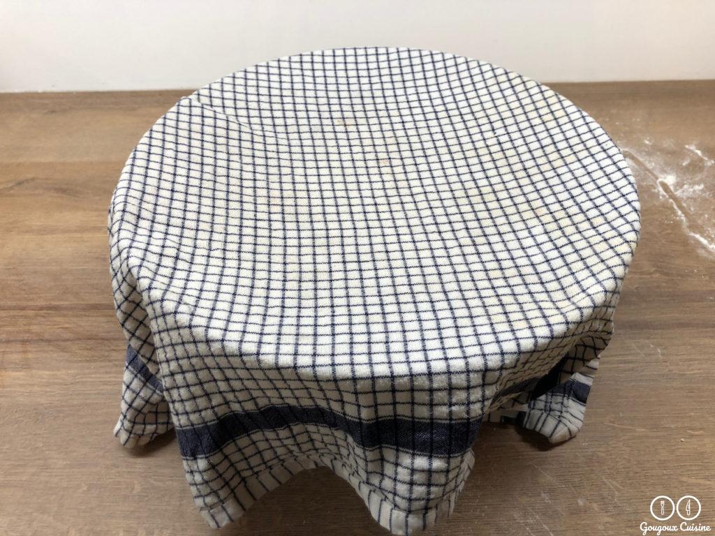 Dans un saladier (22cm de diamètre par exemple ici), mettre un torchon peu épais et fariner le fond. Déposer la pâte à l'envers dans un saladier. Couvrir le saladier et mettre au chaud (vers un radiateur par exemple) pour 1h30 de poussée environ.