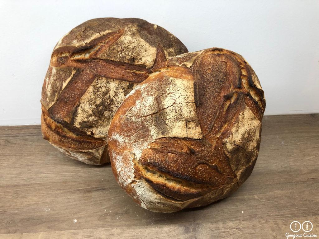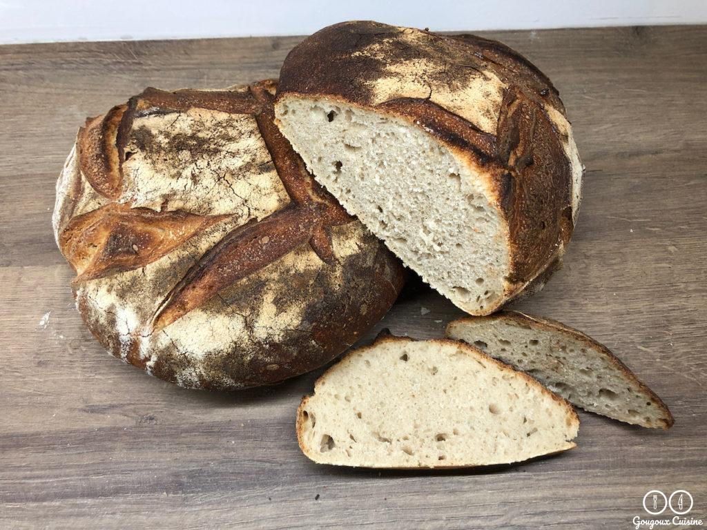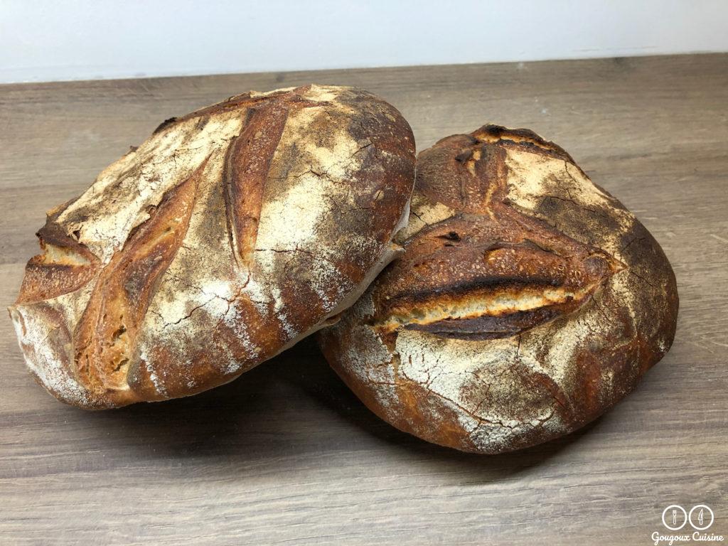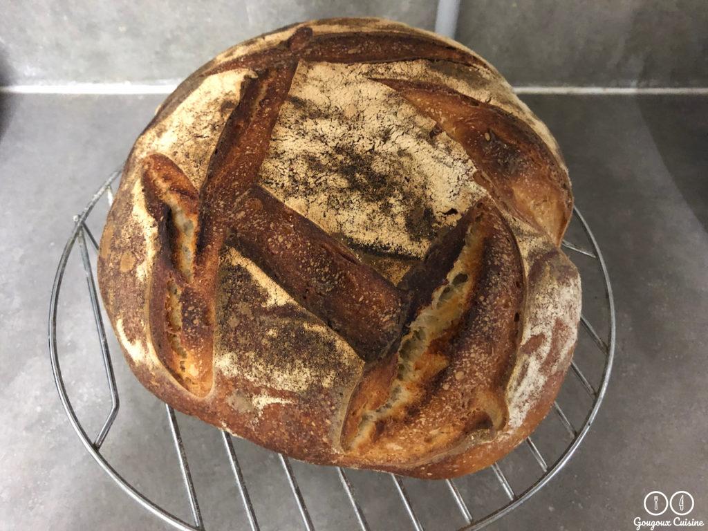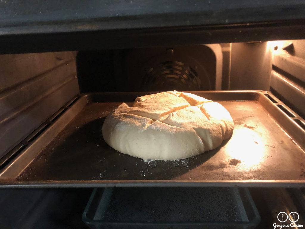 Enfourner pour 30 min. A 10 et 20 min, je pulvérise quelques pschitt d'eau (avec un pulvérisateur comme les plantes) au dessus du pain pour aider à la coloration, mais ce n'est pas obligatoire.