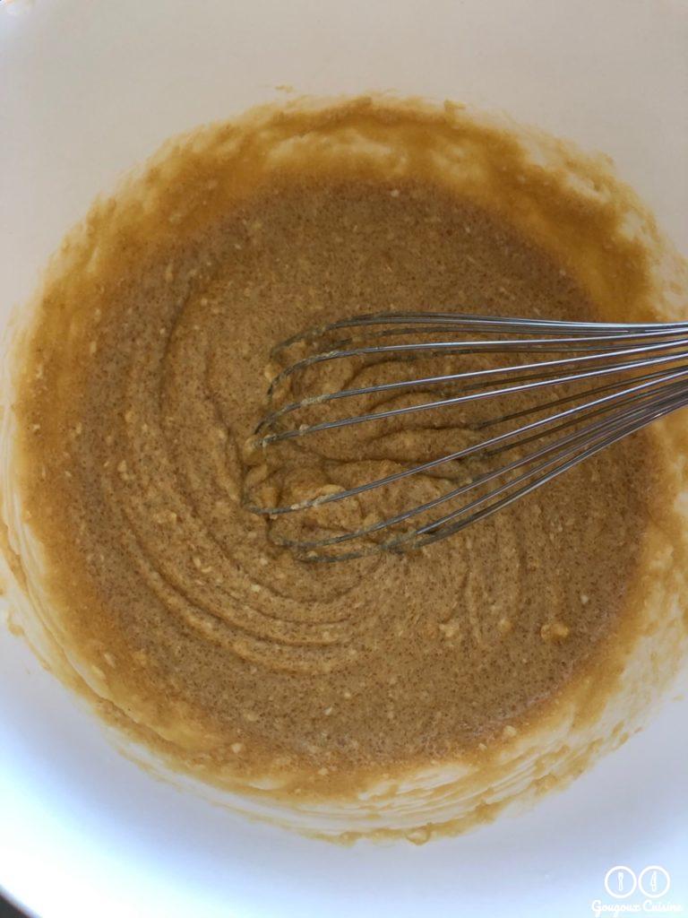 Dans un saladier, mélanger au fouet le beurre fondu, la cassonade et les oeufs.
