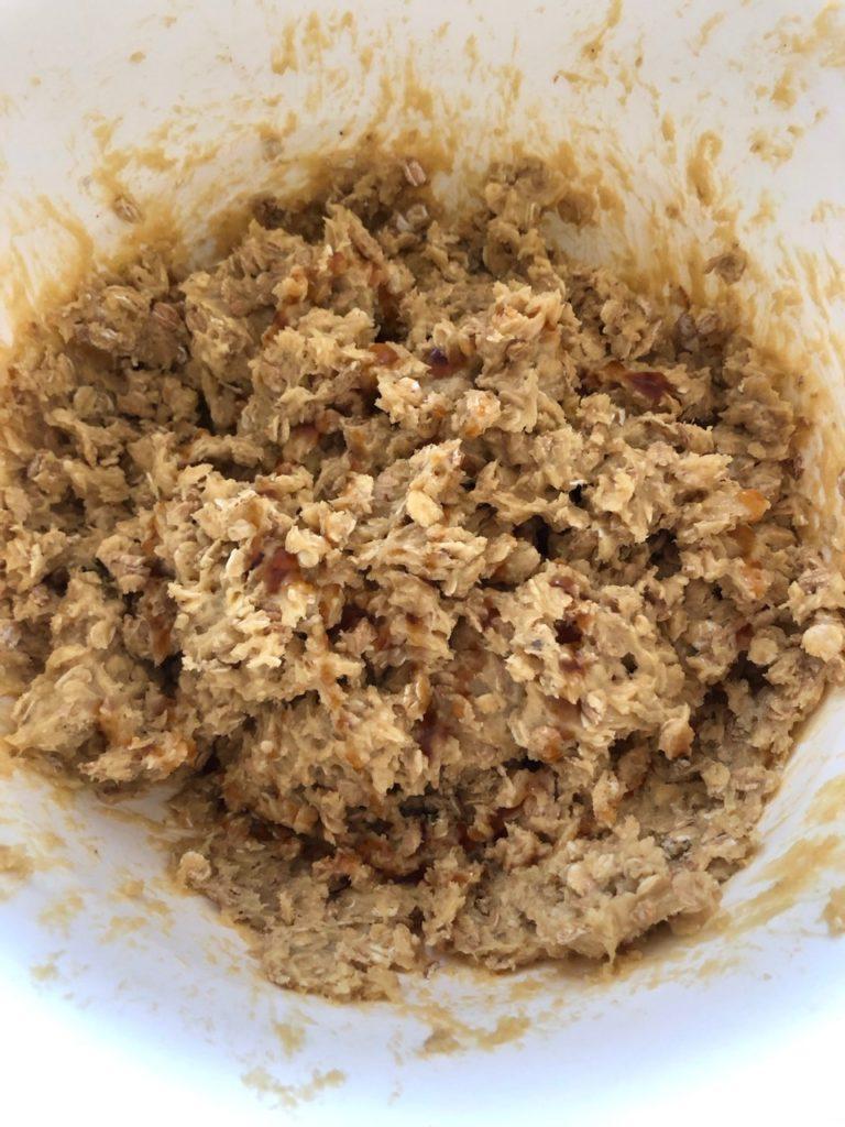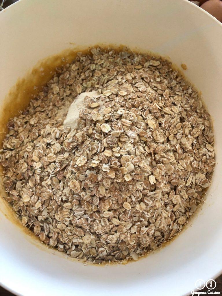 Ajouter la farine, les flocons d’avoine et la levure chimique.