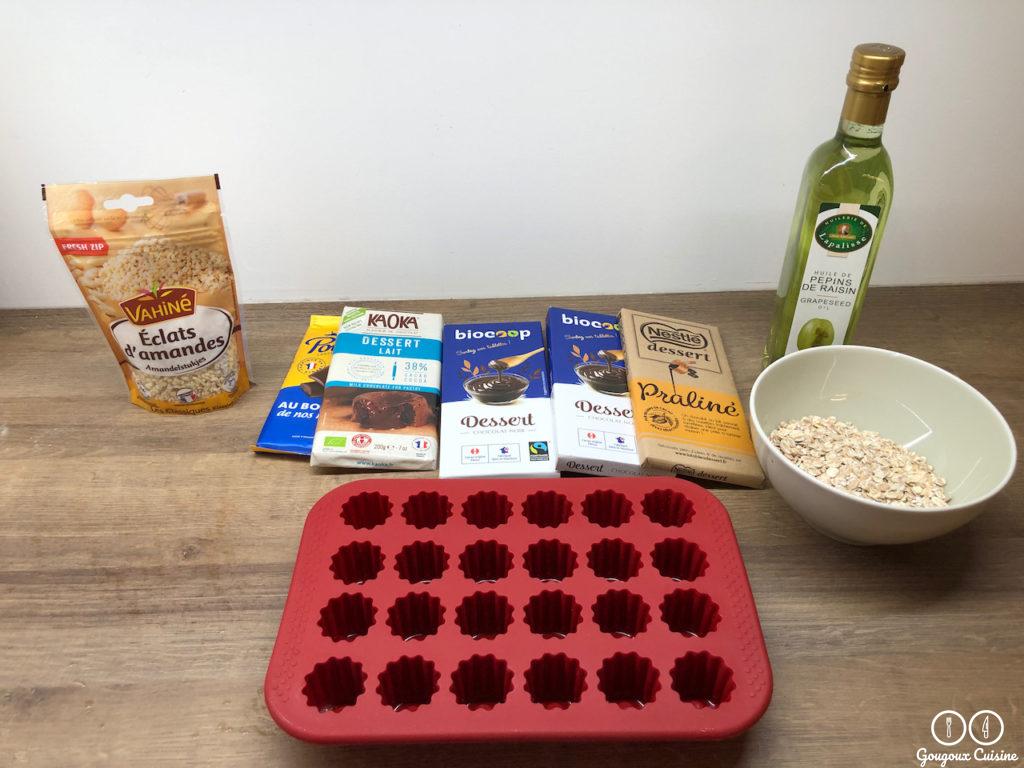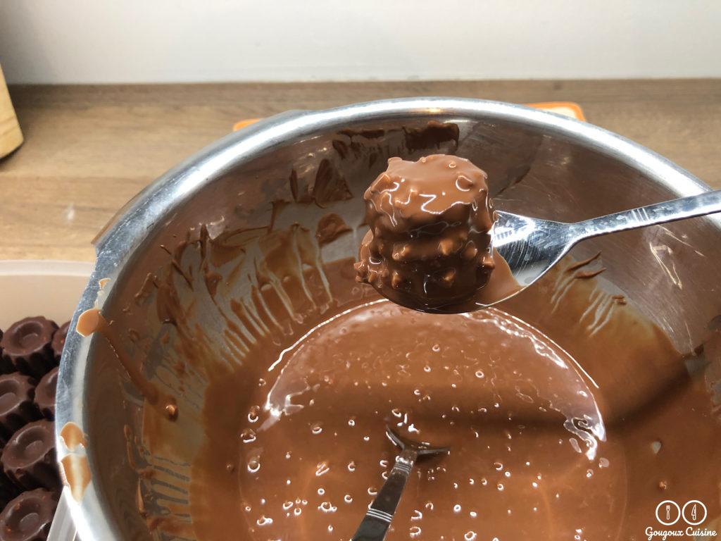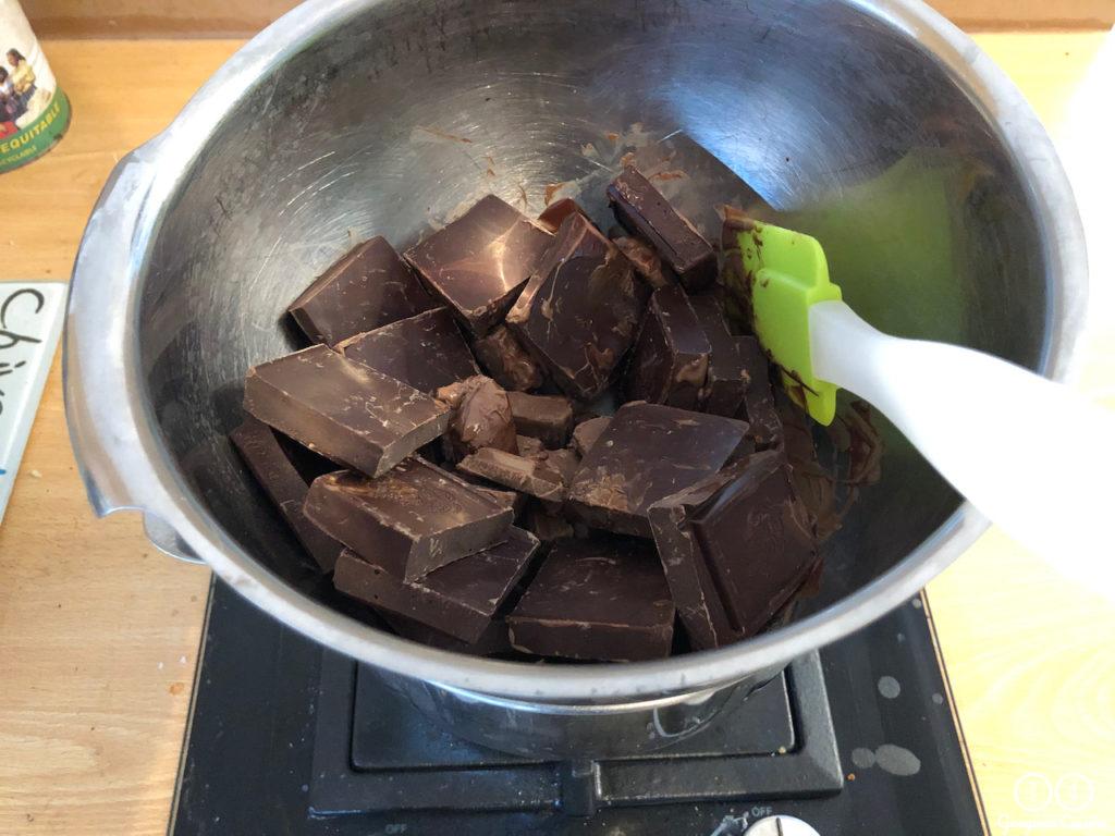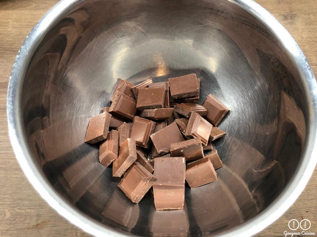 Couper en morceaux le chocolat noir et chocolat praliné.
