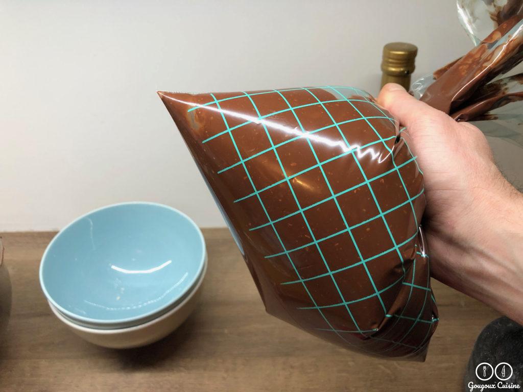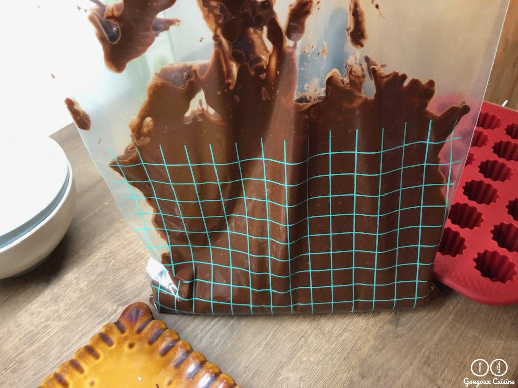 Astuce : mettre le reste de la poche au frigo. Une fois refroidi et le chocolat solidifié, vider la poche dans une assiette pour récupérer tout le chocolat.