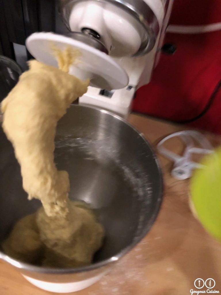 Puis ajouter la préparation de levure et commencer à mélanger au robot avec le crochet. Ajouter petit à petit le reste de lait tiède jusqu'à obtenir une pâte collante.