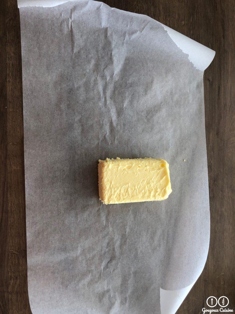 Mettre la plaquette de beurre dans un papier sulfurisé et donner des coups de rouleau à patisserie pour l'aplatir dans le papier.
