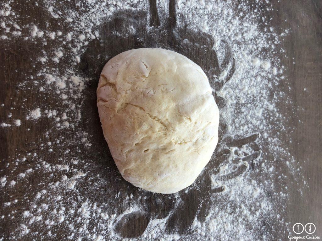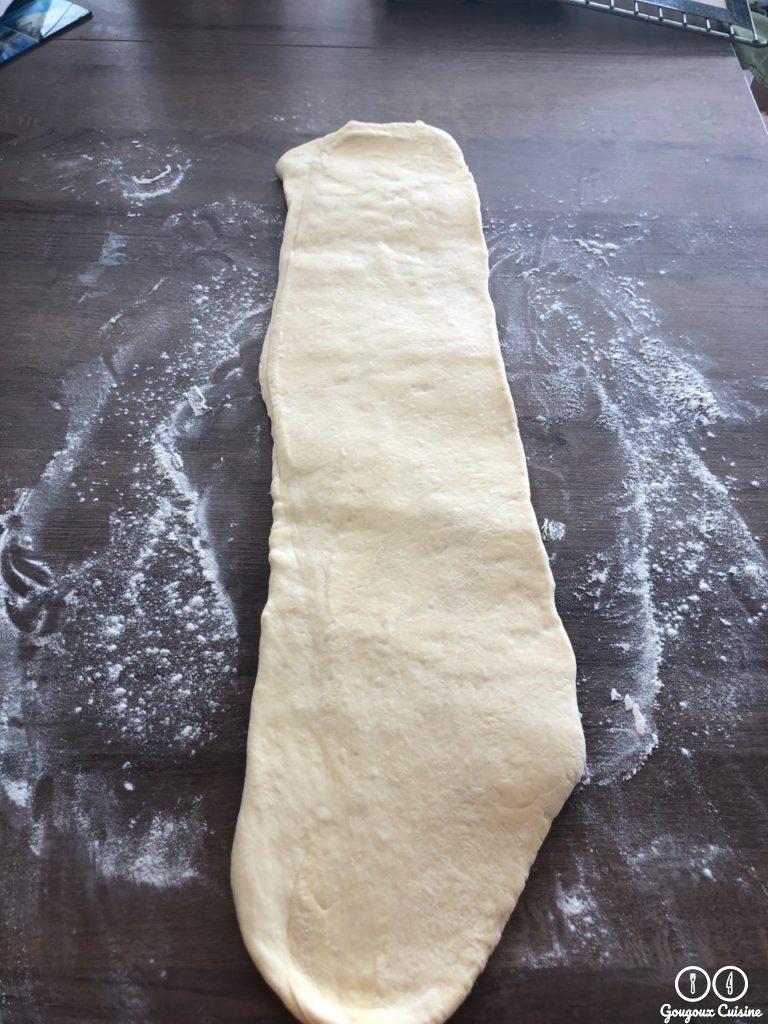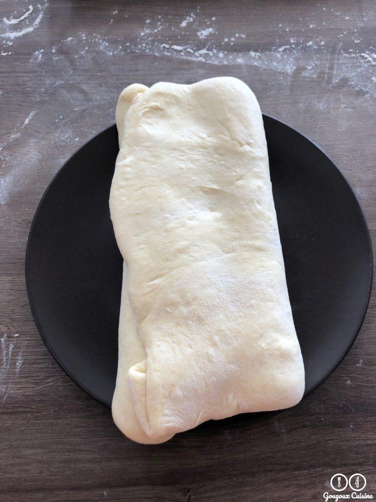 Rabattre les 4 coins de la pâte au centre. Puis rabattre la moitié de la pâte du haut sur le bas puis rouler doucement pour l'agrandir de haut en bas.
