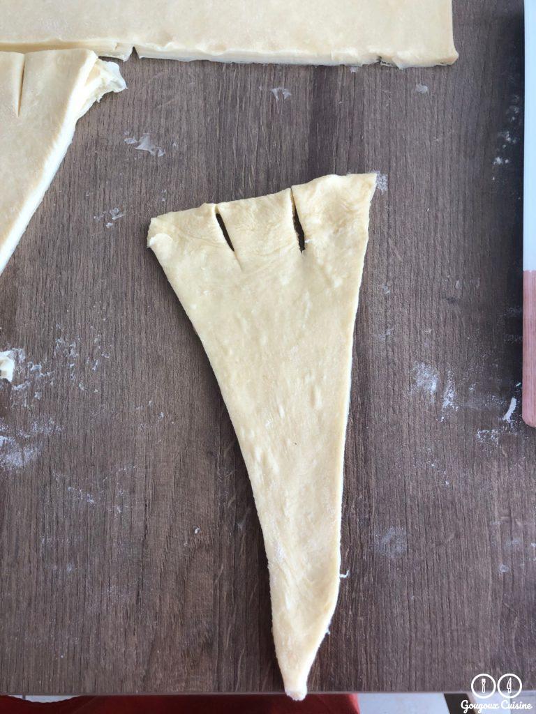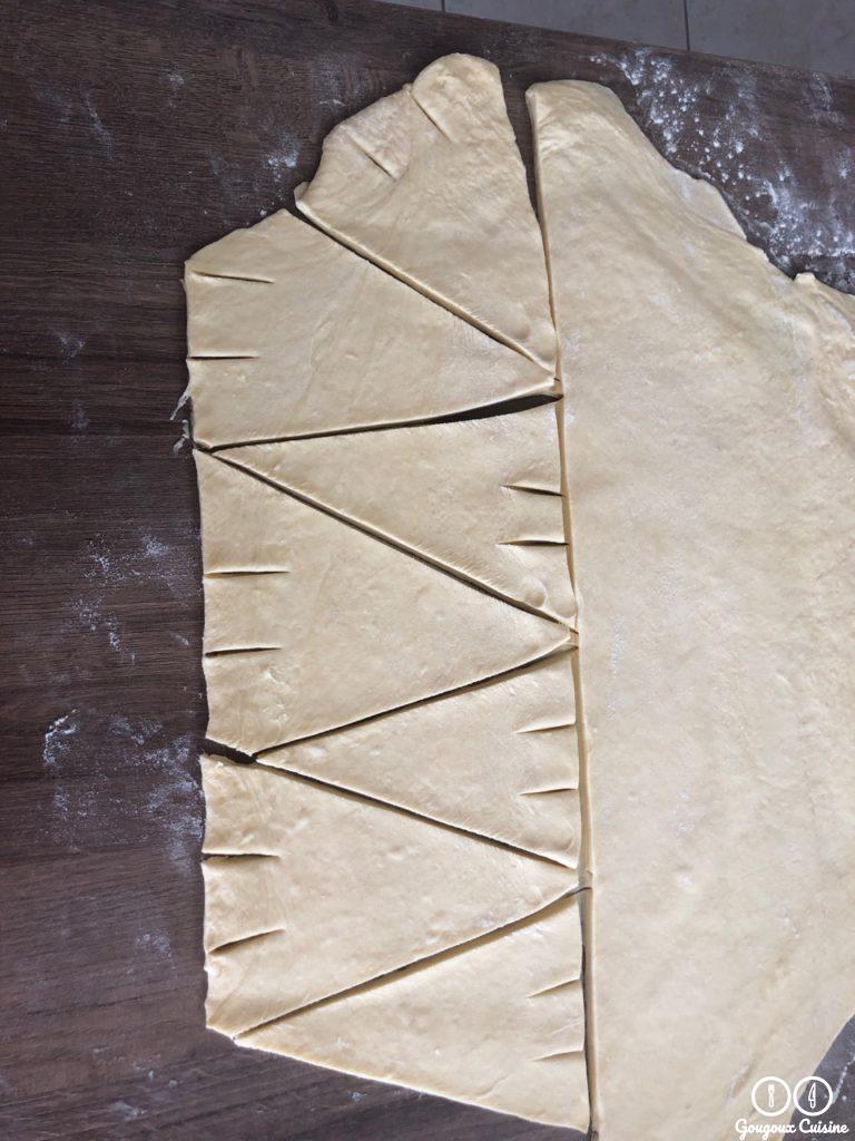 Etaler la pâte feuilletée sur le plan de travail pour faire un grand rectangle de 30x60cm environ. Couper en deux dans le sens de la longueur puis faire des triangles. Couper deux fois sur le grand côté pour pouvoir rabattre le croissant plus facilement.