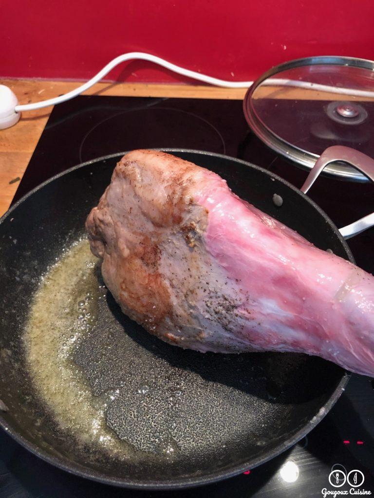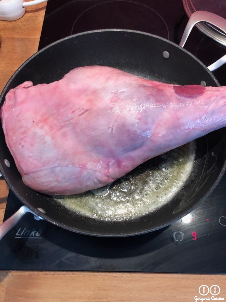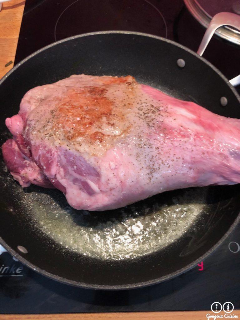 Saisir le gigot sur toutes ses faces. Saler et poivrer au fur et à mesure.