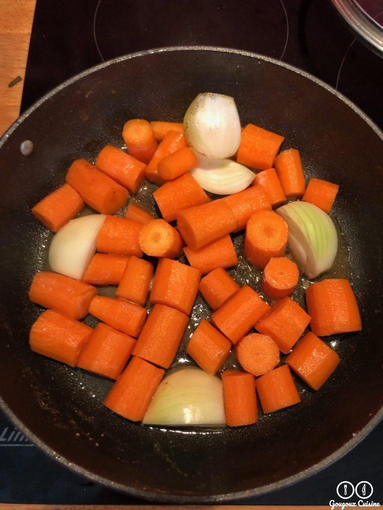 Faire revenir les carottes et oignons dans la poêle qui a servi à colorer le gigot.