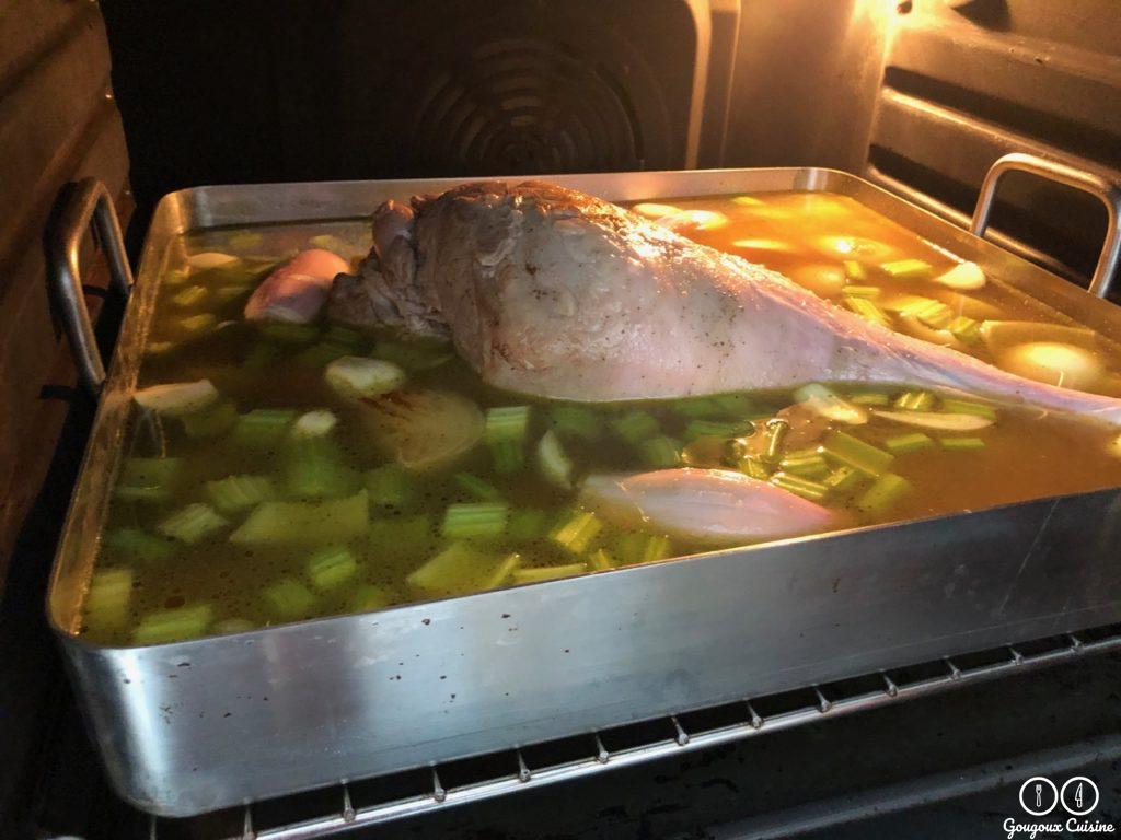 Le lendemain matin, tourner le gigot sur lui même et enfourner de nouveau à 120°C pour 3h minimum.