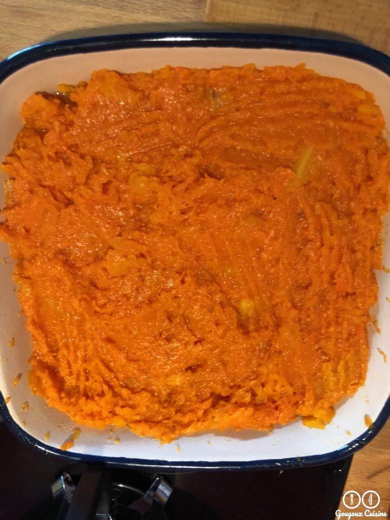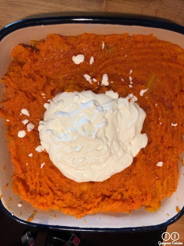 Éplucher la courge, couper en dés et faire cuire à l'autocuiseur 20-25 min. Laisser égoutter ensuite et écraser à la fourchette dans la passoire pour enlever le plus d'eau possible.