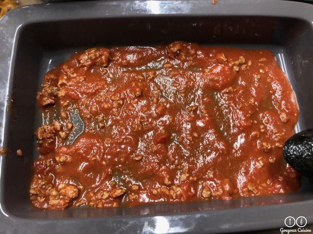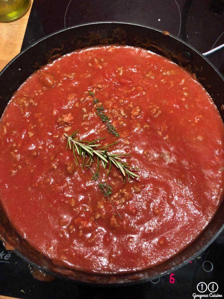 Une fois la viande hachée cuite, ajouter le coulis, les tomates en dés et les herbes. Laisser mijoter à couvert pendant 20 min.