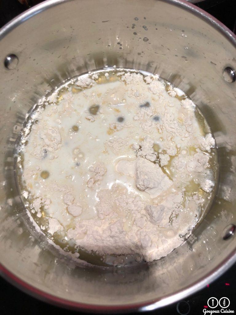 Démarrer un roux avec 50g de farine, l'huile et un peu de lait à feu fort.