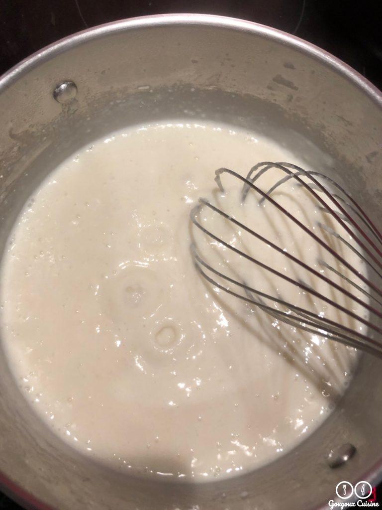 Remuer sans discontinuer avec un fouet en ajoutant le lait petit à petit, en gardant une consistance un peu épaisse. Si le mélange devient un peu plus liquide, ajouter de la farine petit à petit.