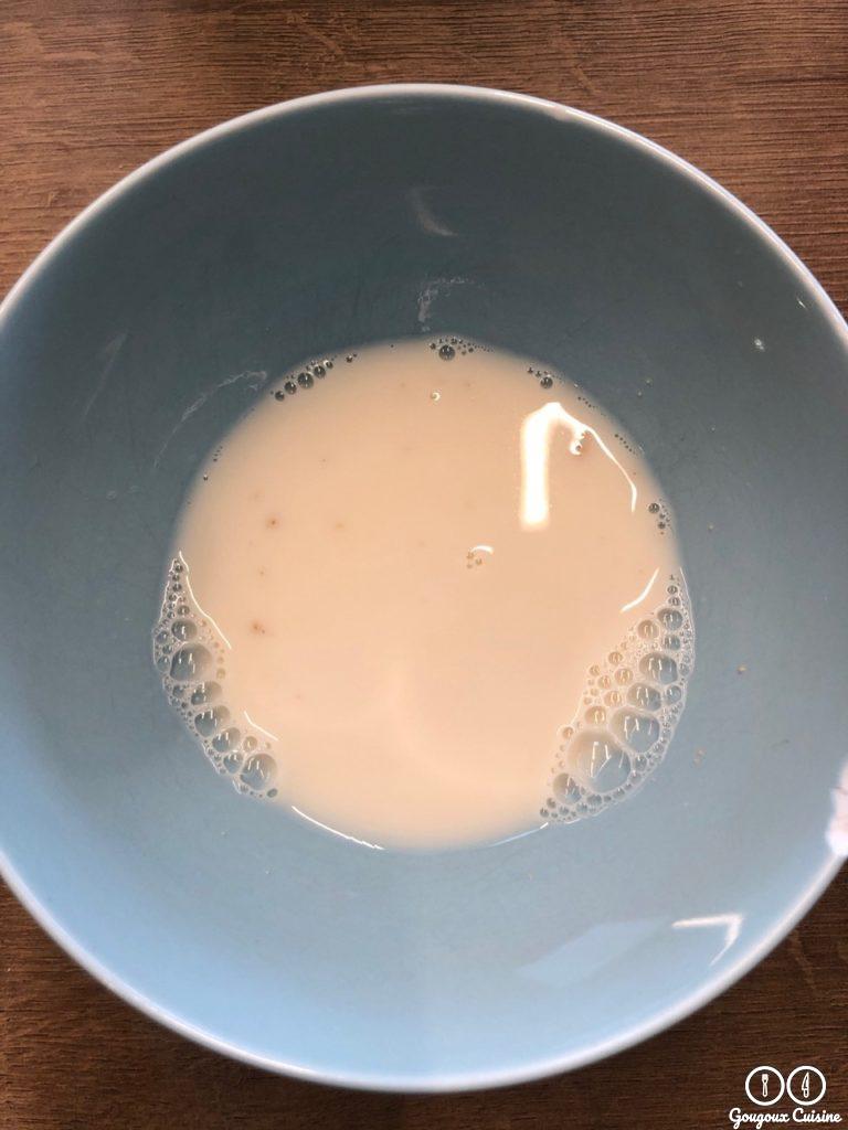 Verser 50g de lait, 50g d'eau tiède et la levure dans un bol et mélanger. Laisser reposer 10 min.