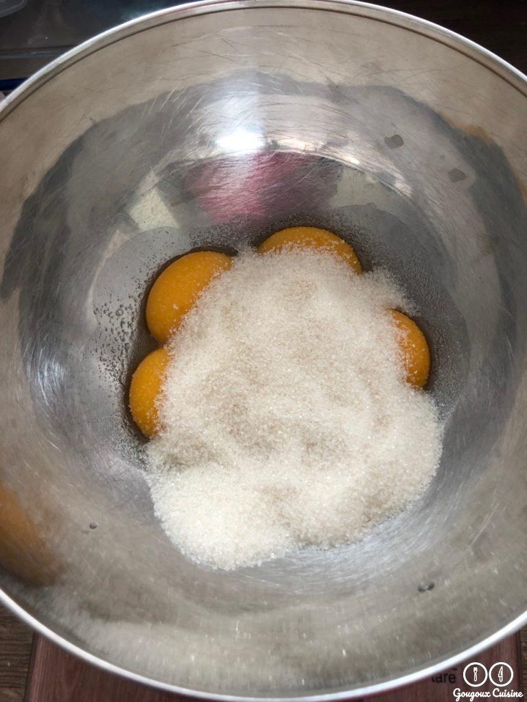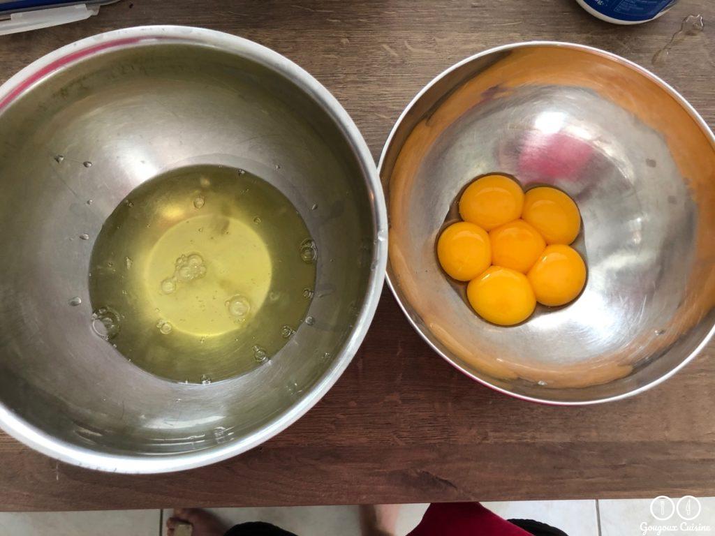 Dans 2 bols, séparer les blancs des jaunes des oeufs.