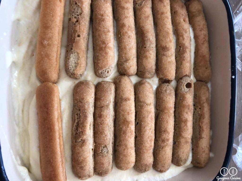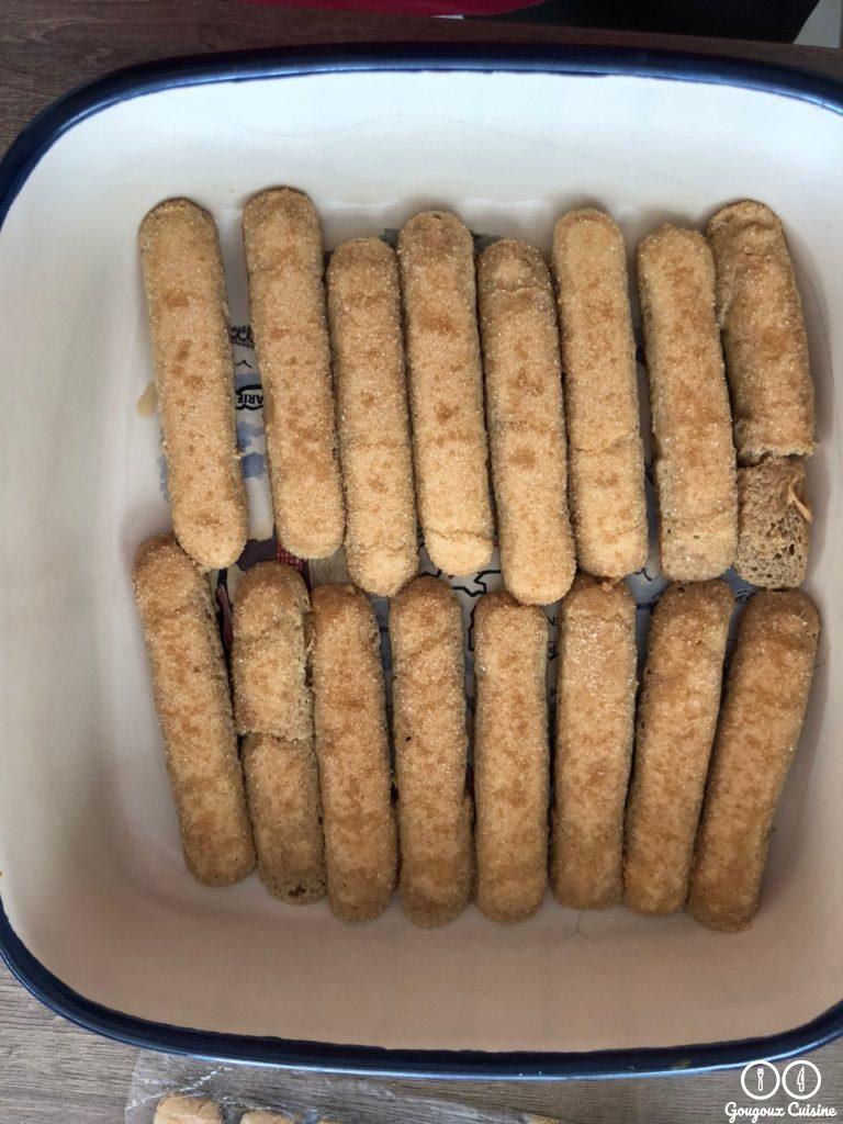 Préparer un plat puis tremper les boudoirs un par un pour recouvrir le fond du plat. On trempe 1/2 sec ca suffit, sinon le boudoir casse et reste dans le café (dédicace pour papy).